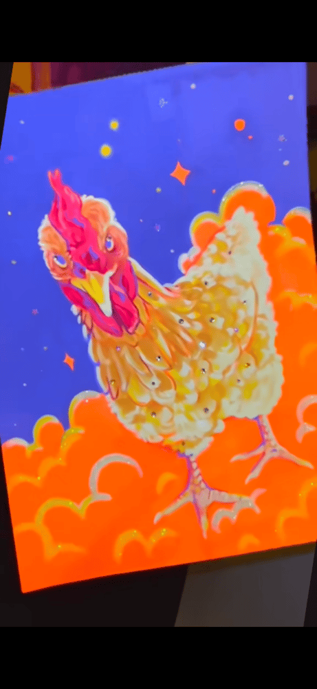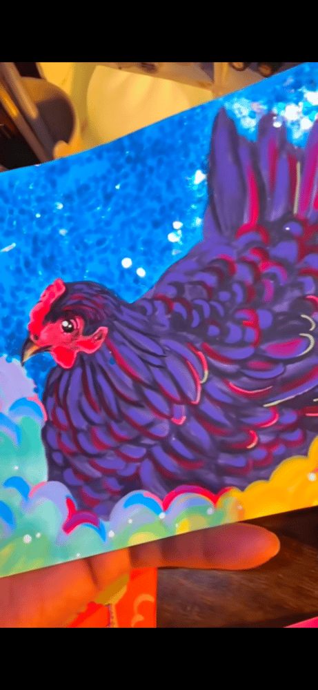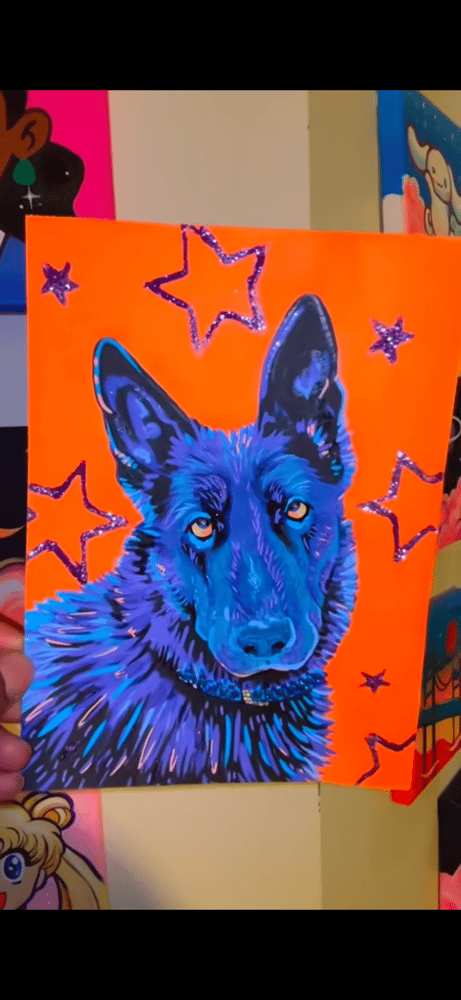 A colorful, hand-drawn acrylic portrait of your pet, finished with glitter and rhinestones for that extra sparkle ✨